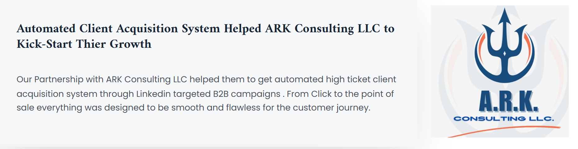 Industry: We have worked a wide range of business industries such as service based businesses, coaching, E-commerce, brick and mortar and Sofwere, but the majority of the business that we partenered with are management consulting firms. Over time we have refined our strategy and found neuances that works well for consultants.